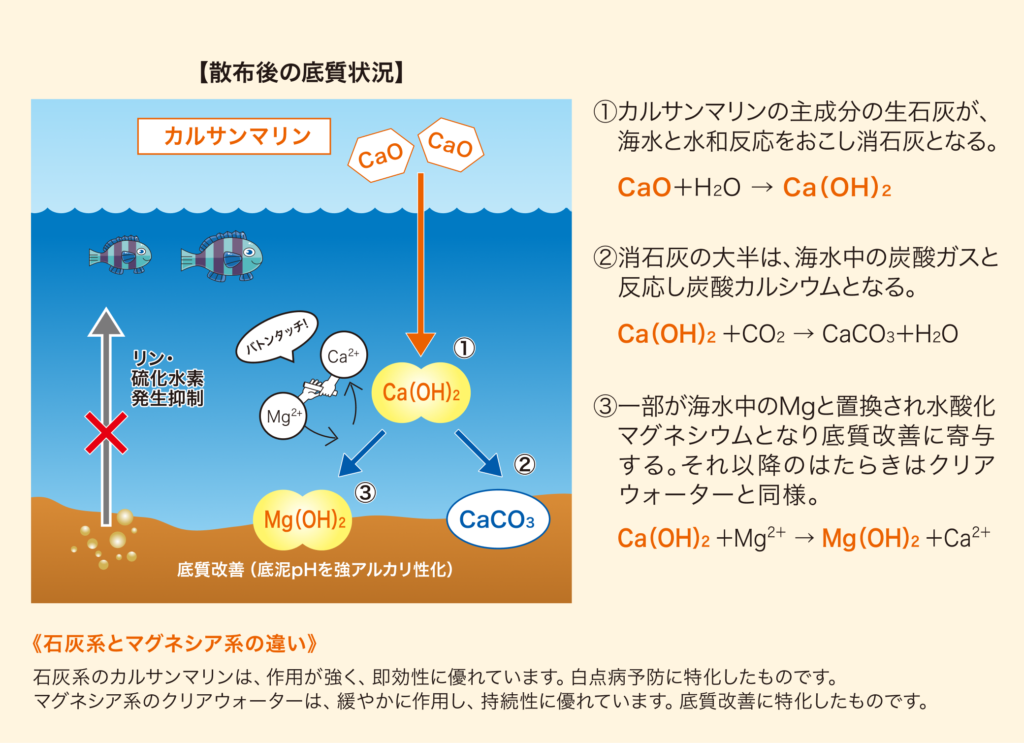 生石灰は水と速やかに反応する為、海底土壌に到達する前に水和してしまいます。カルサンマリンは、海底土壌に到達してから崩壊する為、底泥中の白点虫シストへ無駄なく作用することが可能です。