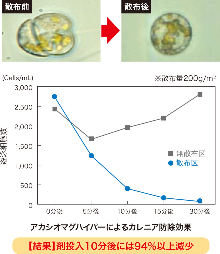 アカシオマグハイパーは、水酸化マグネシウムが主成分の粉状品です。赤潮の運動機能の消失効果がマリノフォーラムで実証されています。海水と混ぜてスラリー状にし、赤潮に直接散布します。散布することによって、水酸化マグネシウムの粒子が赤潮に付着し、沈降・分解させ、魚類の赤潮被害を低減させます。着底後、底質改善及び低質の弱アルカリを維持します。